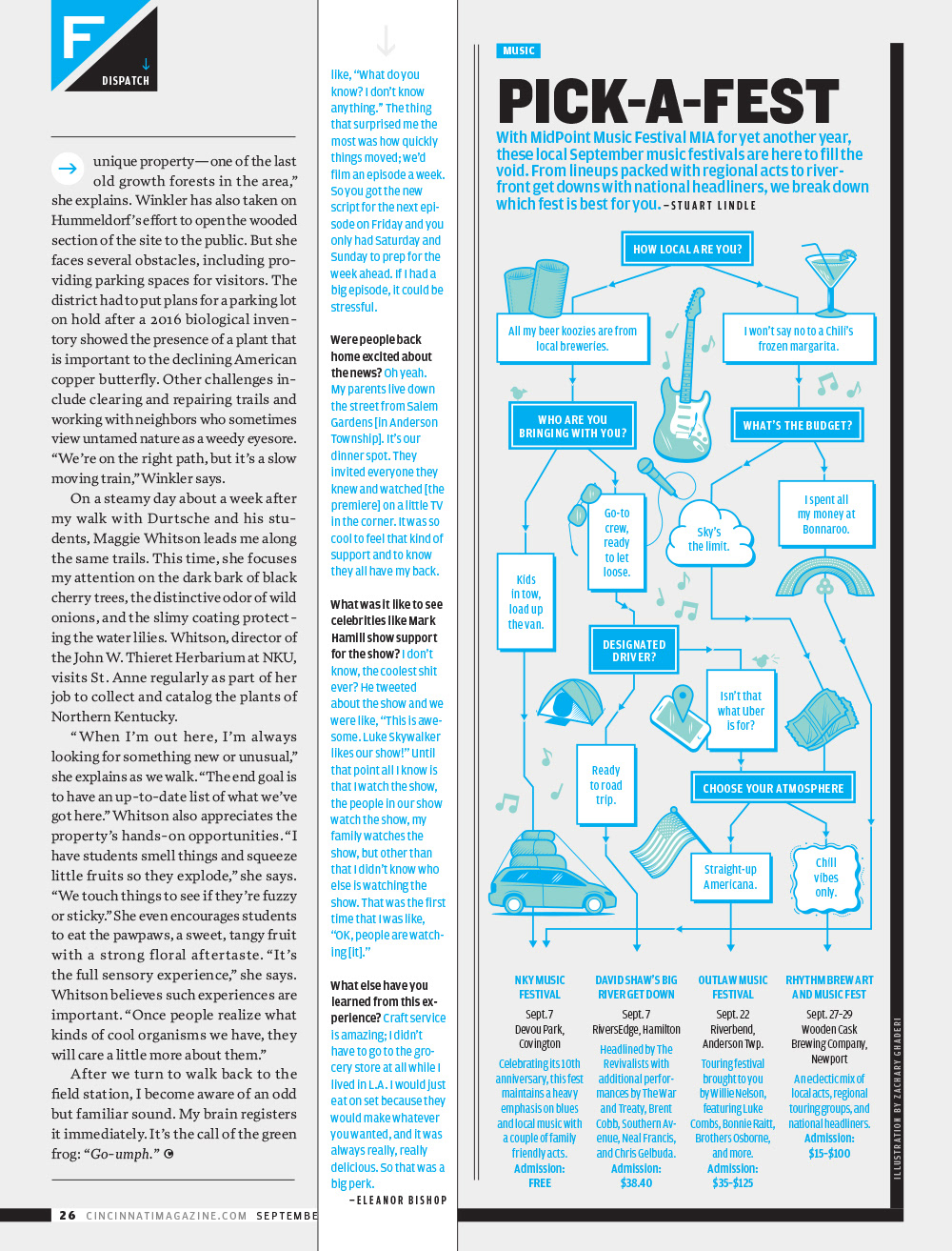 Flow chart illustration for Cincinnati Magazine's Rundown section in the September 2019 issue about various local music festivals throughout the month.