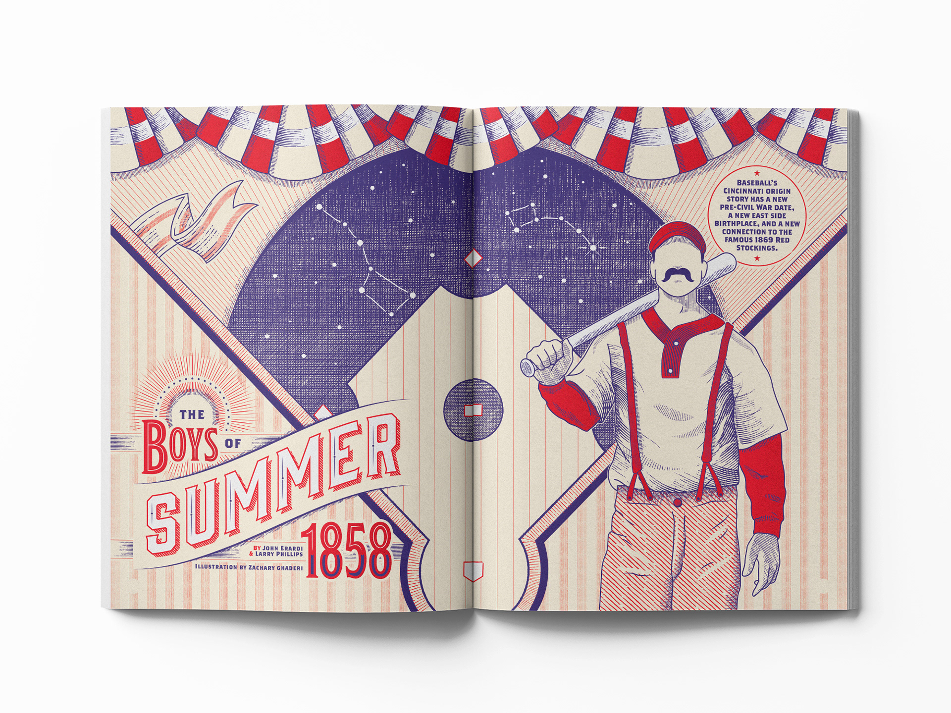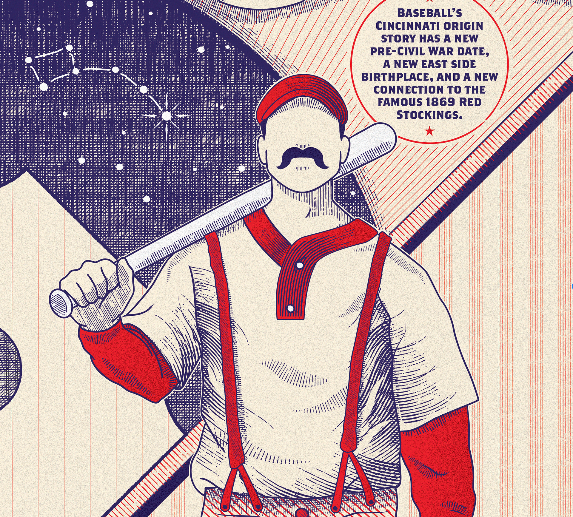 Opening illustration and art direction for Cincinnati Magazine's July '20 feature article about Cincinnati's first baseball games.